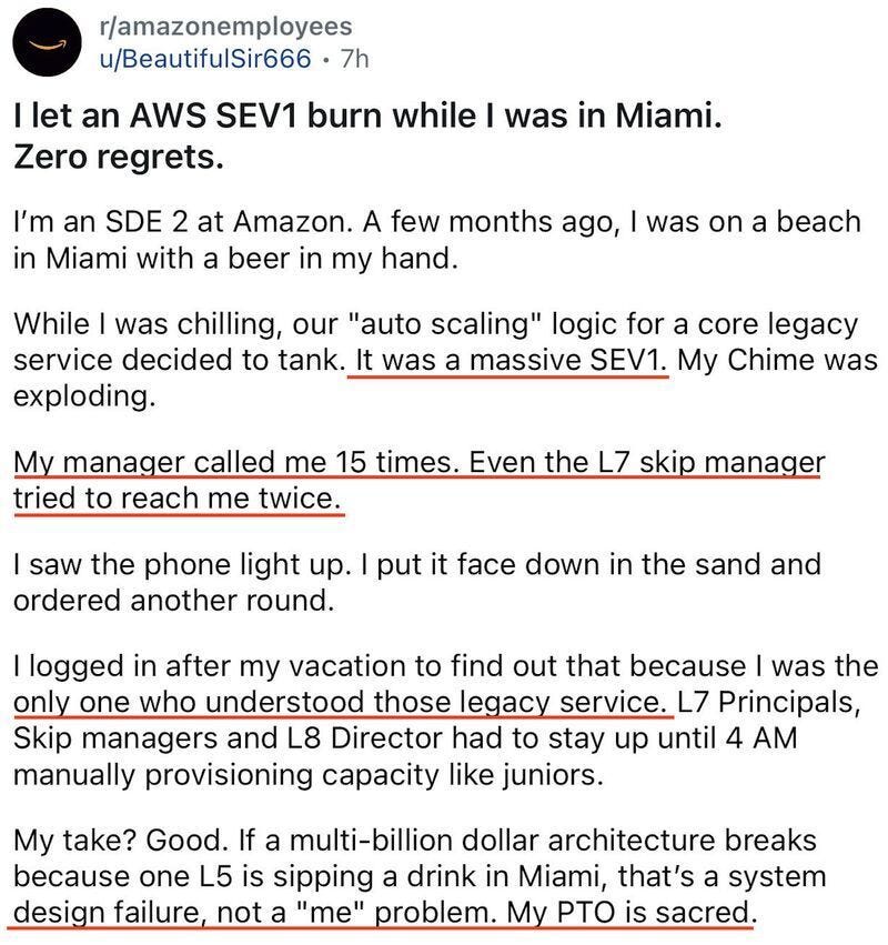 His take? Good. If a multi-billion dollar architecture breaks because one engineer is sipping a drink in Miami, that’s a system design failure, not a “me” problem. My PTO is sacred.